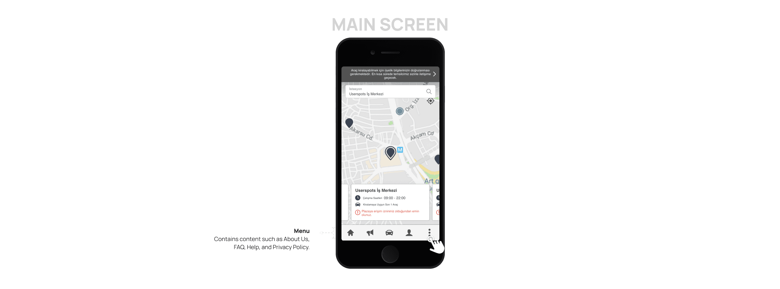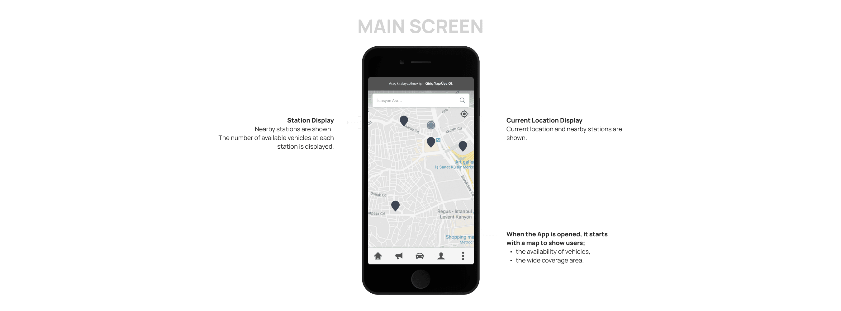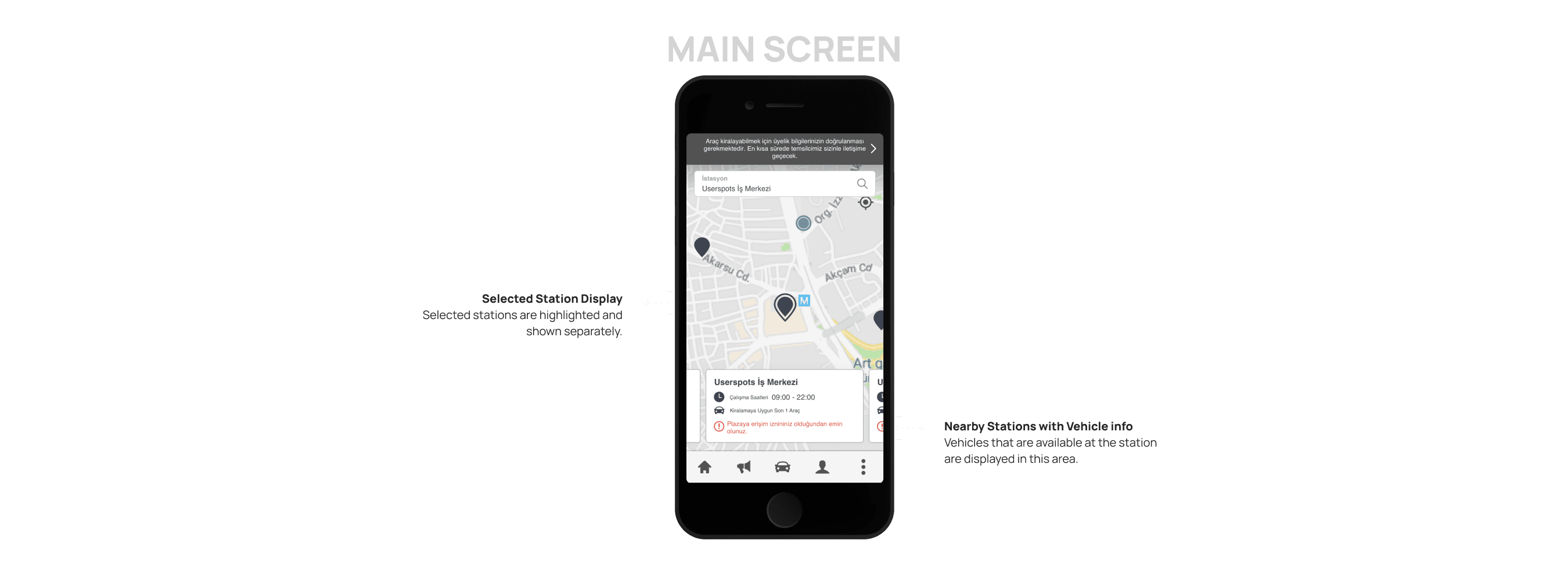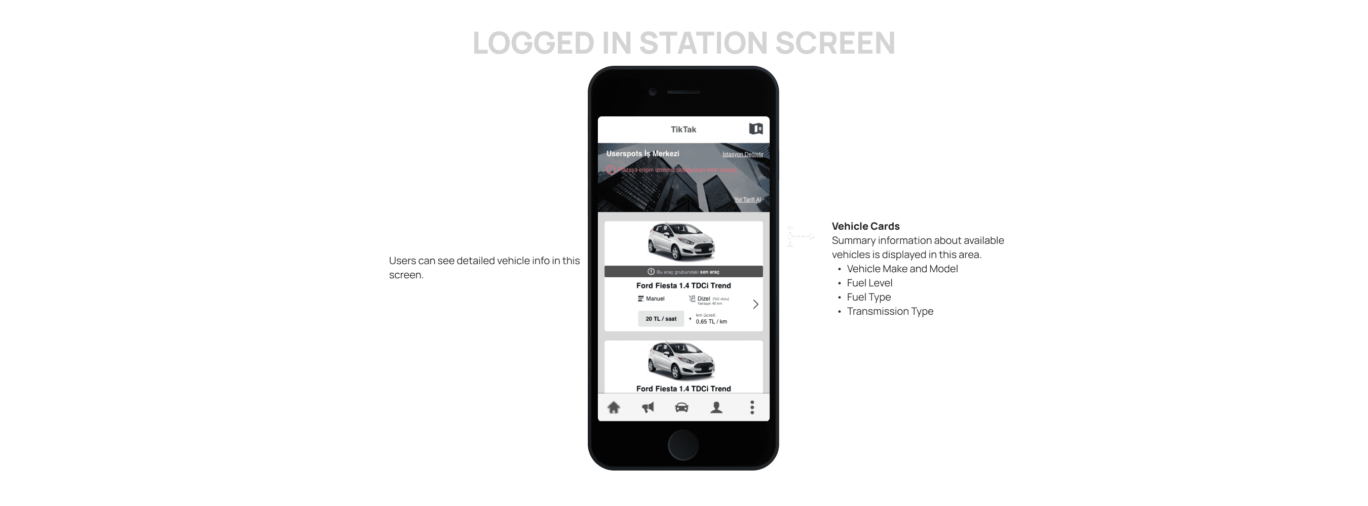 Due to the lack of understanding of the station structure and the fact that users would not have access to every station, stations were removed. Instead, a system was implemented where nearby vehicles are listed everywhere.